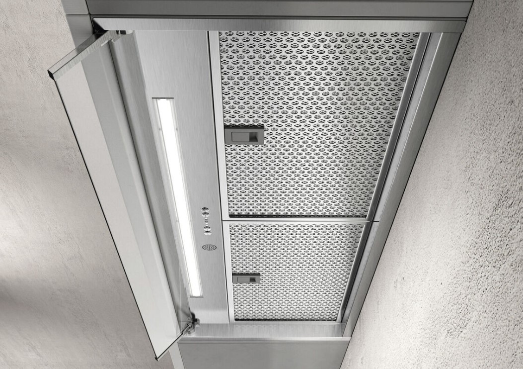 Вытяжки, встраиваемые в столешницу — эффективная инновация, которая подойдет для установки в кухне любой площади. Такие вытяжки размещаются за варочной поверхностью или рядом с ней. В отключенном состоянии всасывающая панель находится под столешницей, но после включения одной или нескольких конфорок она автоматически выдвигается при помощи специального лифтового механизма. Загрязненный воздух улавливается, не успевая распространиться по помещению. Когда вытяжка убрана, на виду остается только сенсорная панель управления. Недостатком подобных моделей является только сравнительно высокая цена.