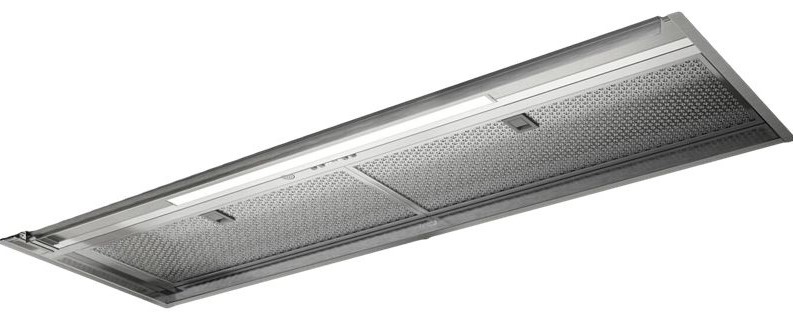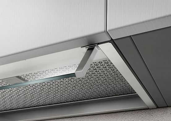 Встраивание вытяжки в шкаф — оптимальный вариант для малогабаритной кухни. Такие модели просты в установке, недороги, практически скрыты от глаз, их не нужно подбирать по внешнему виду, а также чем-то маскировать воздуховод. Уровень шума также снижается благодаря дополнительной звукоизоляции. Встроенные в шкаф модели могут дополняться выдвижной панелью, которая увеличивает площадь забора загрязненного воздуха. Иногда к встраиваемым относят также вытяжки, которые монтируются под подвесной шкаф, хотя их корпус остается на виду.