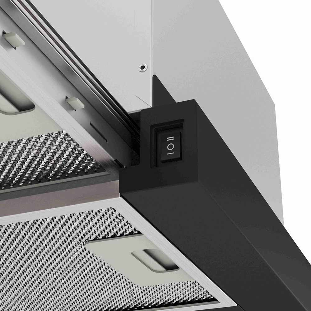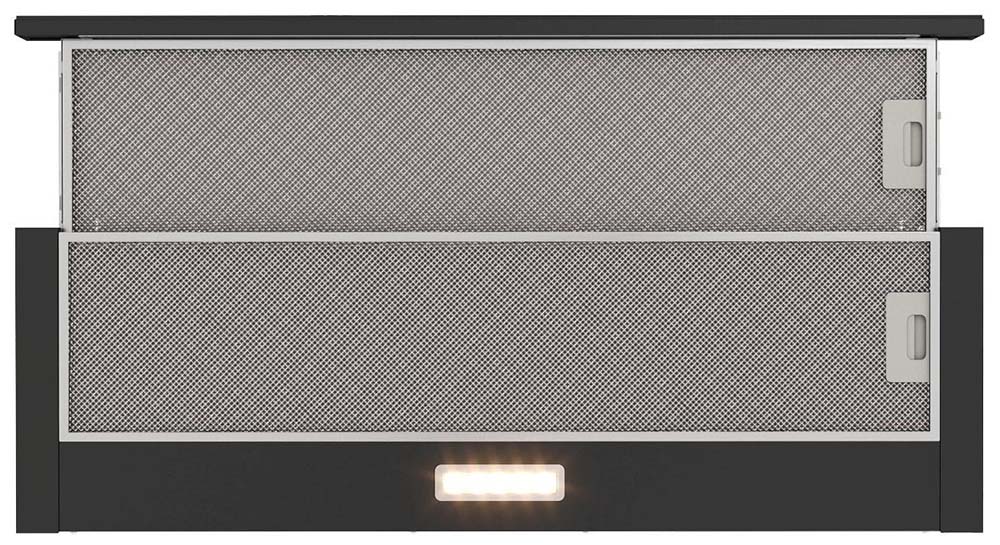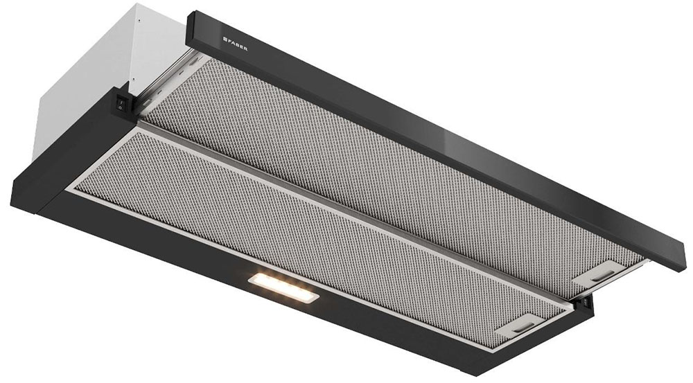 Можно выделить два основных вида вытяжек с выдвижной панелью. В вытяжках, встраиваемых в подвесной шкаф, выдвижная панель необходима, так как размеры таких устройств определяются размерами самого шкафа. В закрытом состоянии глубина вытяжки может быть меньше глубины варочной поверхности. Телескопическая выдвижная панель, которая устанавливается преимущественно в устройствах, работающих в режиме отвода, гарантирует полный захват воздуха, загрязненного каплями жира, частицами сажи, испарениями. Панель можно выдвинуть как нажатием на кнопку, так и потянув за ее переднюю часть. В некоторых моделях при подобном выдвижении одновременно включается подсветка. Когда же панель убрана, вытяжка становится практически незаметной — такой вариант лучше всего подходит для небольшой кухни.