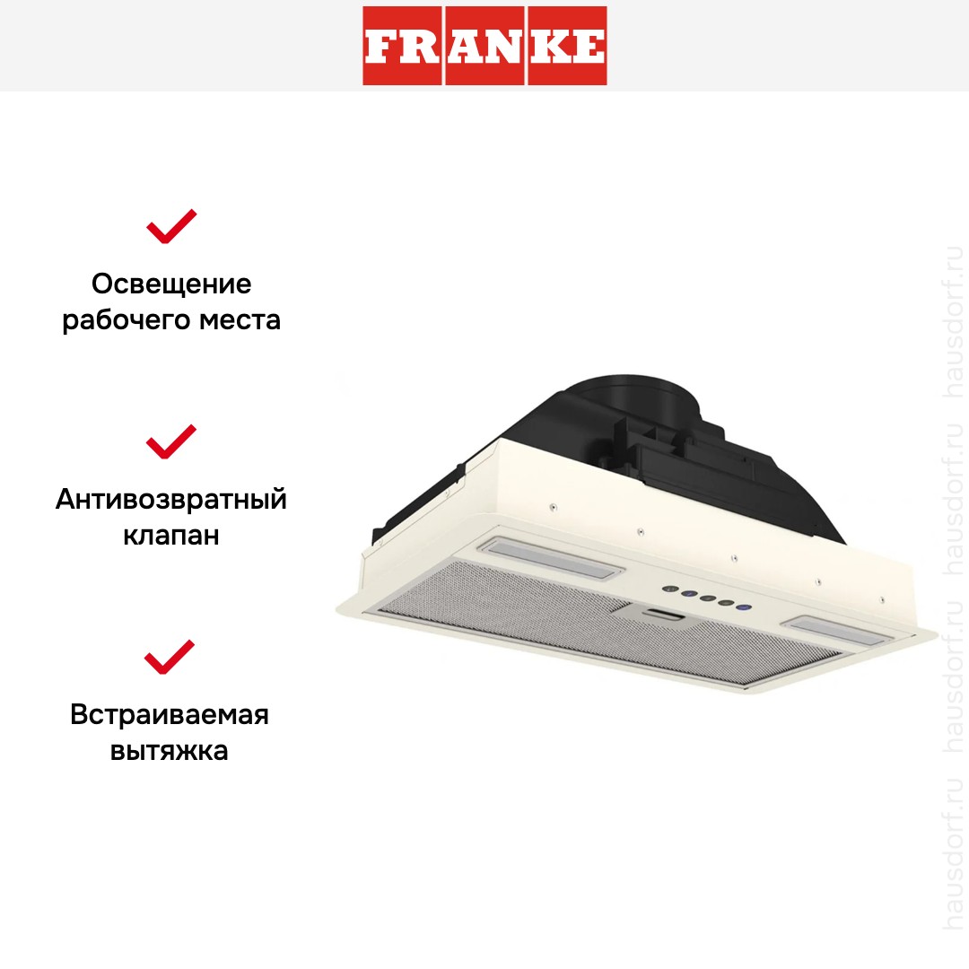 Встраиваемая вытяжка — выбор тех, кто хочет максимально задекорировать технику, или владельцев маленькой кухни. Тип встраивания: в шкаф. Обратите внимание на цветовые сочетания модели Franke FLICK 60 BG, чтобы органично вписать ее в свою квартиру. Оттенок корпуса: бежевый. Благодаря лампочкам, которые расположены на нем, можно освещать плиту и столешницу рядом, чтобы готовить было еще проще и приятнее.