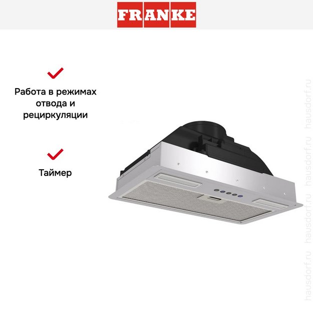 Встраиваемая вытяжка — выбор тех, кто хочет максимально задекорировать технику, или владельцев маленькой кухни. Тип встраивания: в шкаф. Обратите внимание на цветовые сочетания модели Franke FLICK 60 SS, чтобы органично вписать ее в свою квартиру. Оттенок корпуса: серый. Благодаря лампочкам, которые расположены на нем, можно освещать плиту и столешницу рядом, чтобы готовить было еще проще и приятнее.