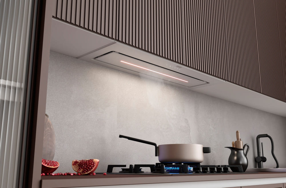 Вытяжка, встраиваемая в потолок, часто устанавливается над кухонным островом в просторной кухне и отличается достаточно высокой мощностью: она может работать как в режиме рециркуляции, так и в режиме отвода, так как воздуховод также скрыт в потолке. Вытяжки могут монтироваться в подвесной потолок либо устанавливаться в специальные многоярусные конструкции из гипсокартона непосредственно во время ремонта кухни. Для управления ими используется пульт ДУ.