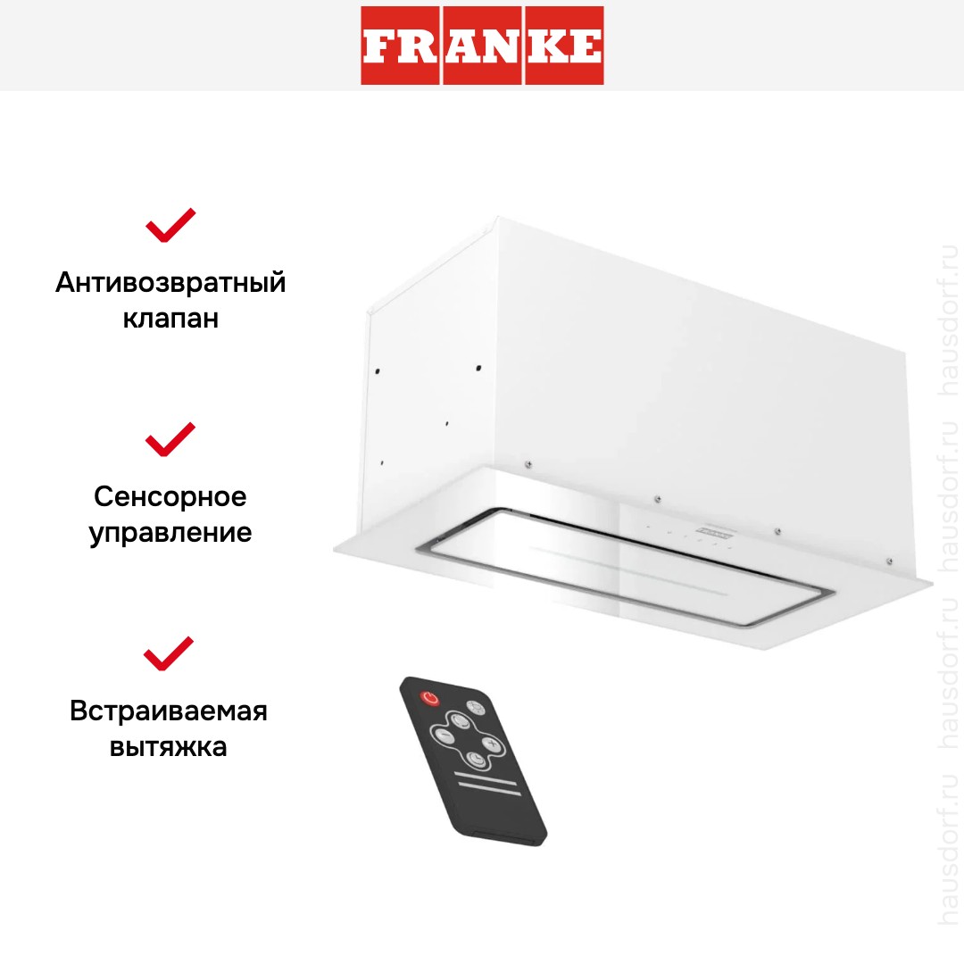Встраиваемая вытяжка — выбор тех, кто хочет максимально задекорировать технику, или владельцев маленькой кухни. Тип встраивания: в шкаф. Обратите внимание на цветовые сочетания модели Franke LUCE 60 WH, чтобы органично вписать ее в свою квартиру. Оттенок корпуса: белый. Благодаря лампочкам, которые расположены на нем, можно освещать плиту и столешницу рядом, чтобы готовить было еще проще и приятнее.