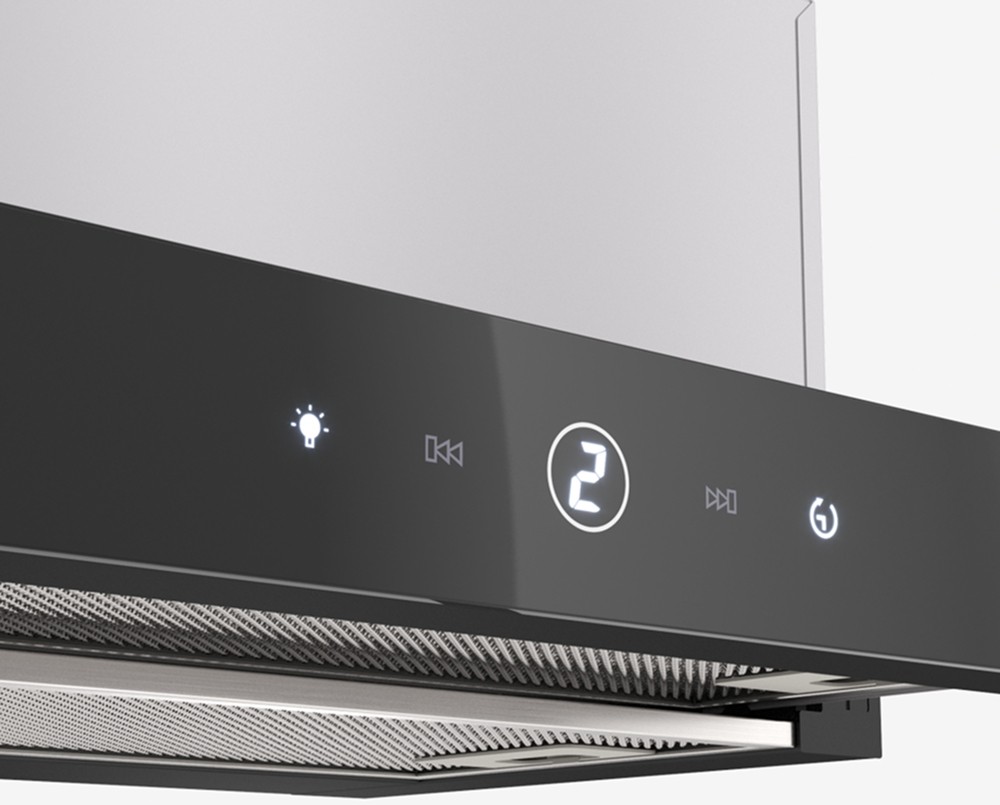 Сенсорная электронная панель управления оснащается цифровым дисплеем, на котором высвечивается основная информация о текущем состоянии устройства. Для выбора скорости всасывания в таких вытяжках будет достаточно одной кнопки: ее последовательное нажатие позволяет изменять ступени мощности, а их значение появляется на дисплее.