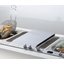 Вытяжки, встраиваемые в столешницу — эффективная инновация, которая подойдет для установки в кухне любой площади. Такие вытяжки размещаются за варочной поверхностью или рядом с ней. В отключенном состоянии всасывающая панель находится под столешницей, но после включения одной или нескольких конфорок она автоматически выдвигается при помощи специального лифтового механизма. Загрязненный воздух улавливается, не успевая распространиться по помещению. Когда вытяжка убрана, на виду остается только сенсорная панель управления. Недостатком подобных моделей является только сравнительно высокая цена.