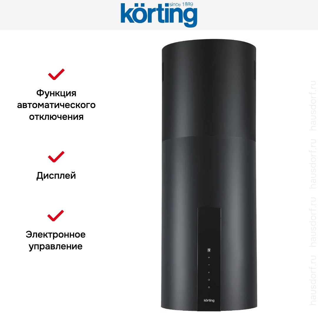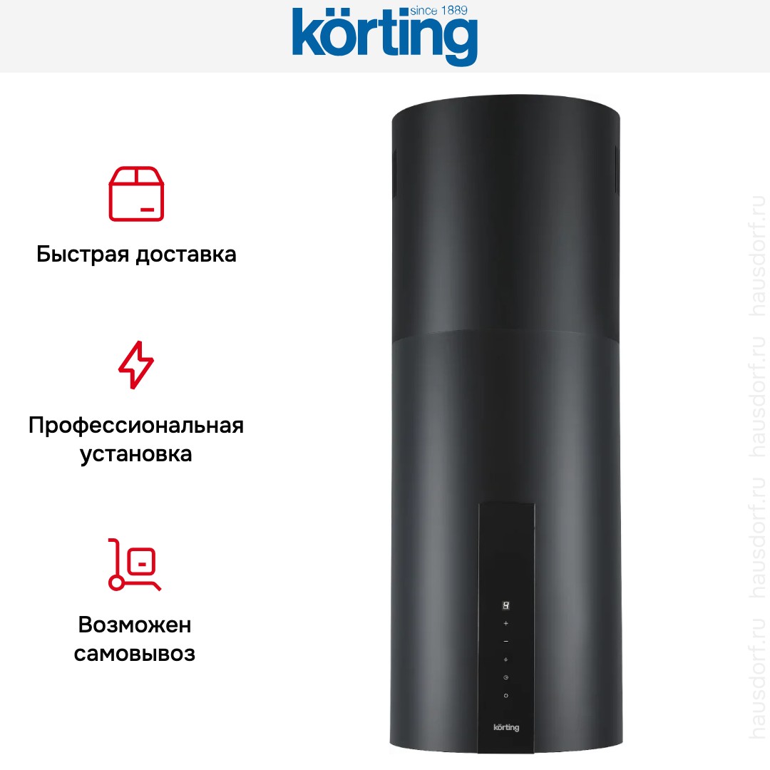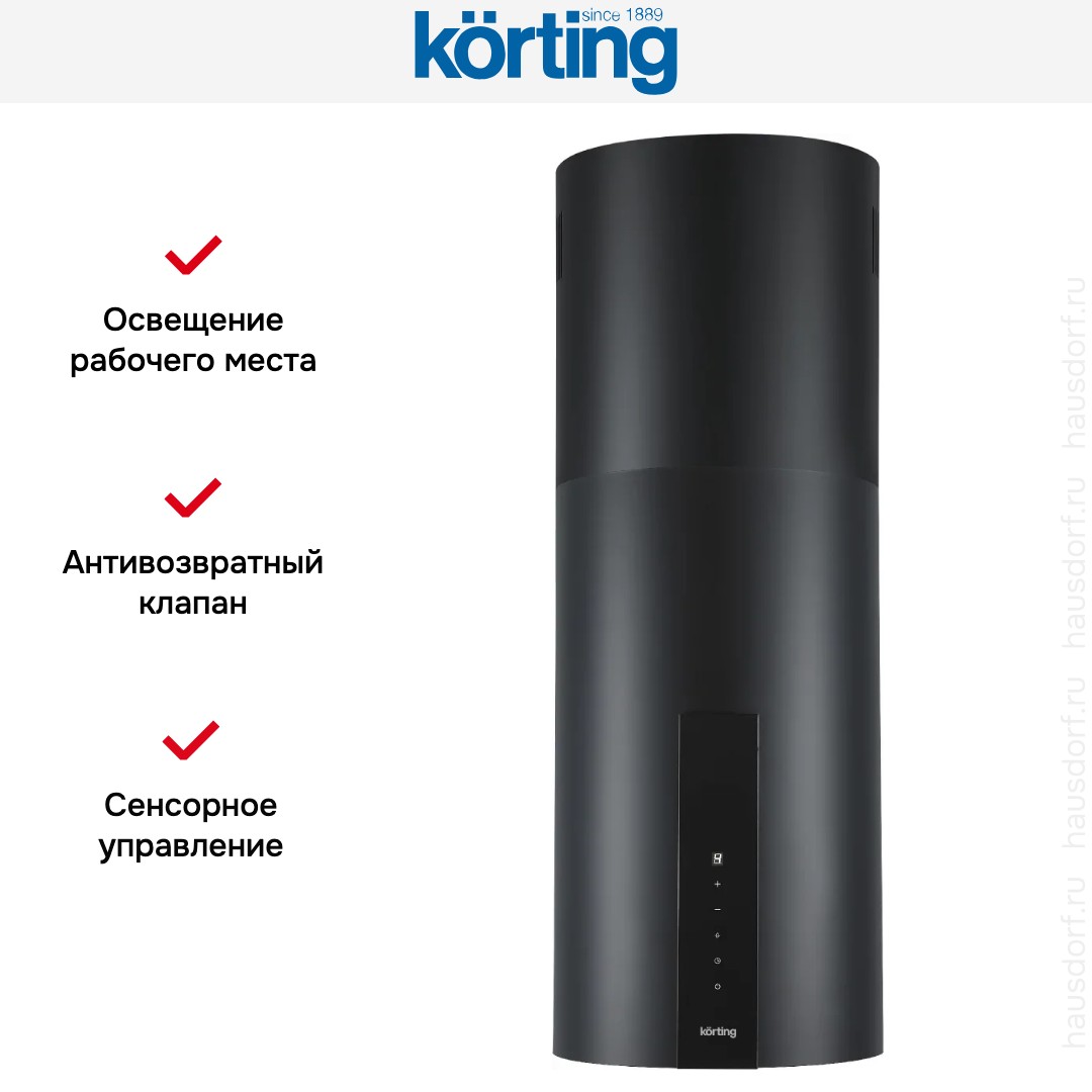 Островная вытяжка Korting KHA 35808 DN Cylinder отличается элегантным цилиндрическим дизайном в чёрном цвете и лаконичной корпусной формой. Её высота регулируется от 99 до 117 см, а компактная круглая база занимает всего 35,15×35,15 см, что позволяет сохранить визуальную лёгкость над кухонным островом. Металлический корпус выполнен в строгой стилистике, хорошо сочетается с современными и минималистичными интерьерами. Фронтальная панель со встроенным дисплеем и сенсорными элементами управления подчёркивает технологичность изделия и удобство повседневного использования.