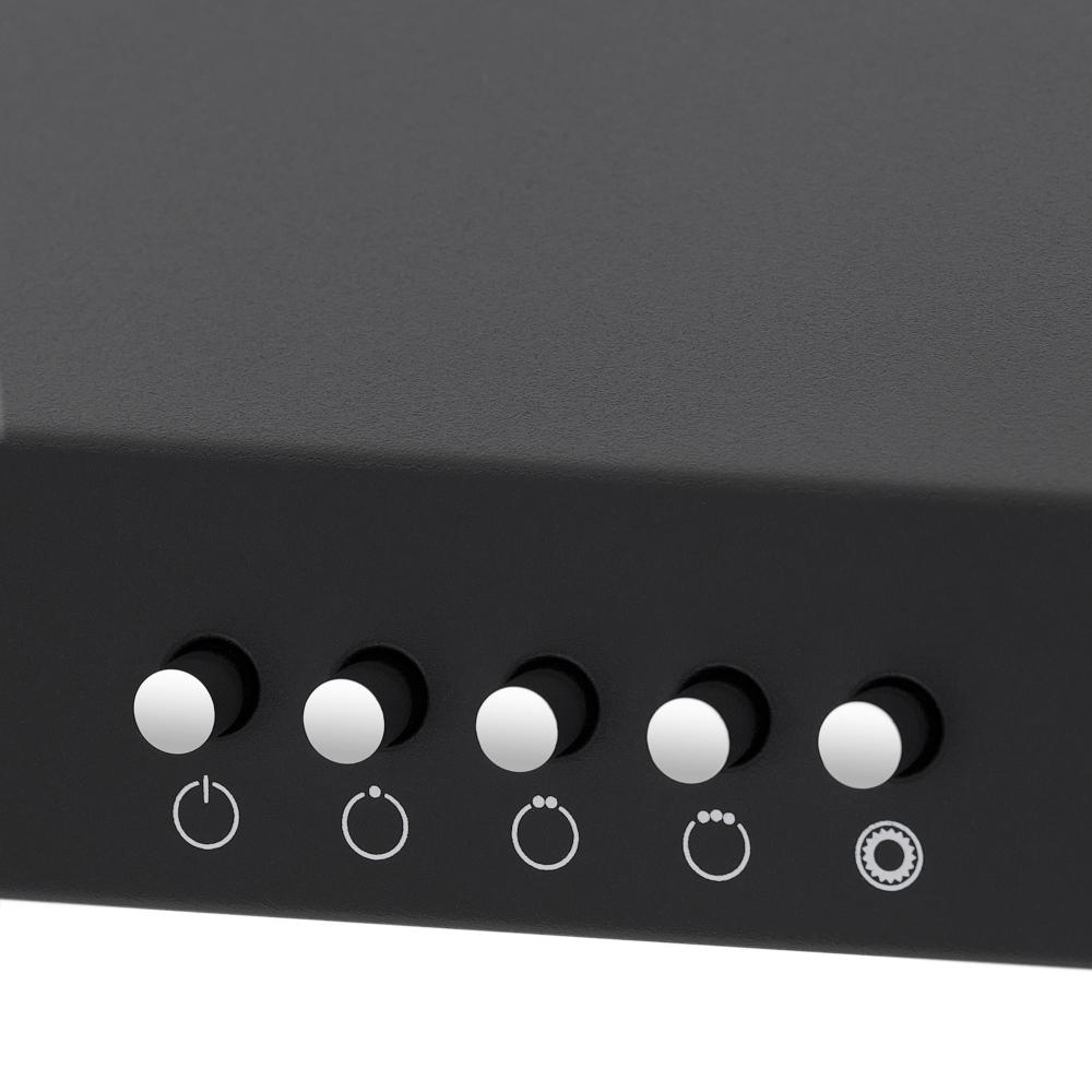 Встраиваемые и простые настенные модели, как правило, оснащаются боковой панелью управления, состоящей из нескольких кнопок. Их количество зависит от числа скоростей, наличия интенсивного режима и встроенного освещения. Боковое расположение панели управления делает вытяжку еще более незаметной.