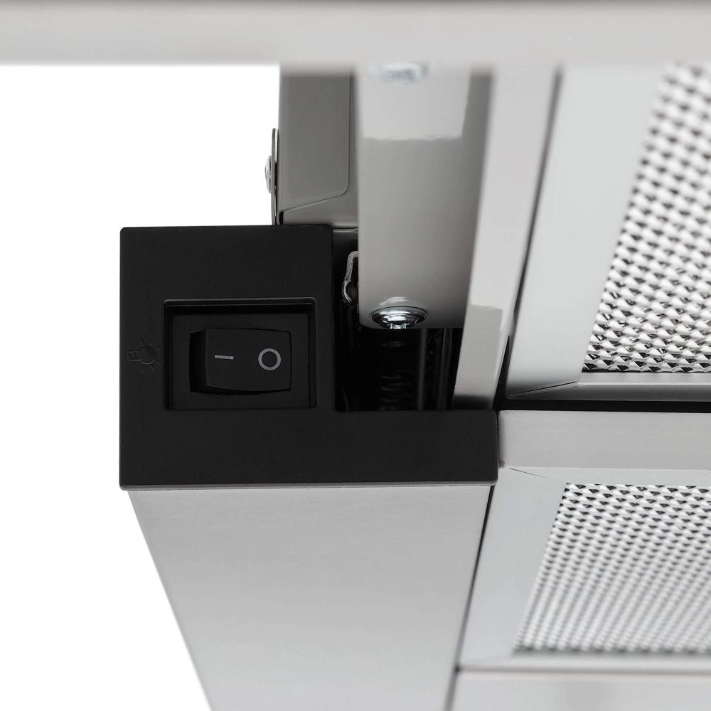 Встраиваемые и простые настенные модели, как правило, оснащаются боковой панелью управления, состоящей из нескольких кнопок. Их количество зависит от числа скоростей, наличия интенсивного режима и встроенного освещения. Боковое расположение панели управления делает вытяжку еще более незаметной.