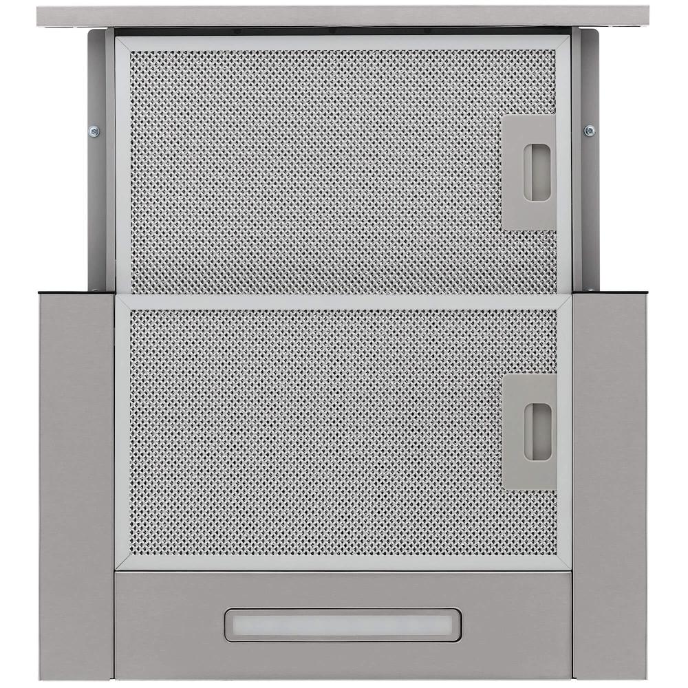 В вытяжках, интегрированных в варочную поверхность и работающих в режиме рециркуляции, панель выдвигается при включении зоны нагрева автоматически. В закрытом же состоянии видны только сенсорные управляющие элементы, которые находятся вровень с варочной поверхностью.