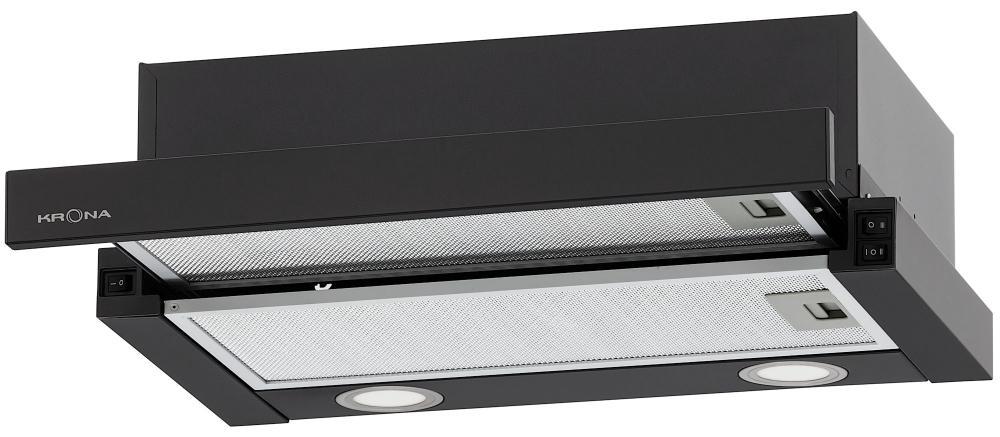 Встраиваемая вытяжка — выбор тех, кто хочет максимально задекорировать технику, или владельцев маленькой кухни. Тип встраивания: в шкаф. Обратите внимание на цветовые сочетания модели KRONA KAMILLA MV 500 BLACK, чтобы органично вписать ее в свою квартиру. Оттенок корпуса: черный. Благодаря лампочкам, которые расположены на нем, можно освещать плиту и столешницу рядом, чтобы готовить было еще проще и приятнее. Фишка этой техники — выдвижная панель.