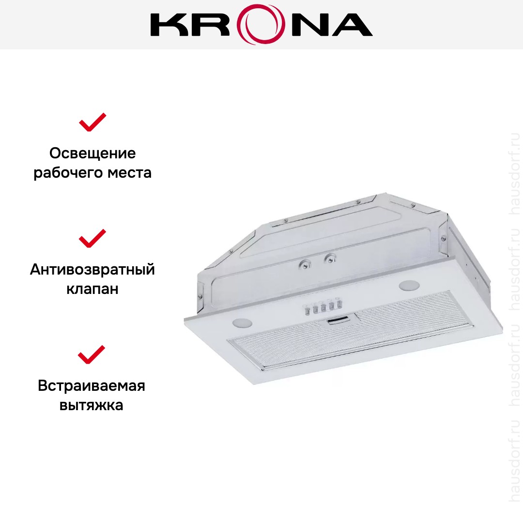 Встраиваемая вытяжка — выбор тех, кто хочет максимально задекорировать технику, или владельцев маленькой кухни. Тип встраивания: в шкаф. Обратите внимание на цветовые сочетания модели KRONA KATE 600 GLASS WHITE PB, чтобы органично вписать ее в свою квартиру. Оттенок корпуса: белый. Благодаря лампочкам, которые расположены на нем, можно освещать плиту и столешницу рядом, чтобы готовить было еще проще и приятнее.
