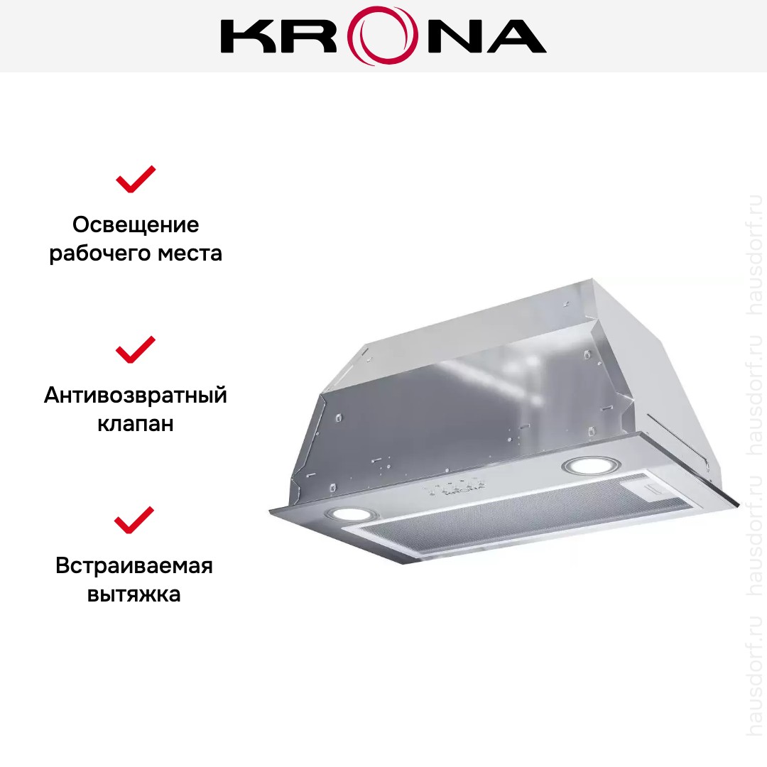 Встраиваемая вытяжка — выбор тех, кто хочет максимально задекорировать технику, или владельцев маленькой кухни. Тип встраивания: в шкаф. Обратите внимание на цветовые сочетания модели KRONA AMBRA 600 inox PB, чтобы органично вписать ее в свою квартиру. Оттенок корпуса: нержавеющая сталь. Благодаря лампочкам, которые расположены на нем, можно освещать плиту и столешницу рядом, чтобы готовить было еще проще и приятнее. Фишка этой техники — выдвижная панель.