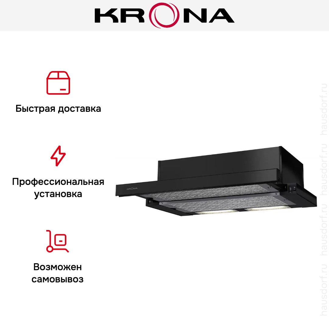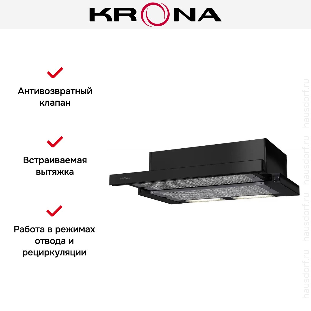 Встраиваемая вытяжка — выбор тех, кто хочет максимально задекорировать технику, или владельцев маленькой кухни. Обратите внимание на цветовые сочетания модели KRONA KAMILLA 600 black (2 мотора), чтобы органично вписать ее в свою квартиру. Оттенок корпуса: черный. Фишка этой техники — выдвижная панель.
