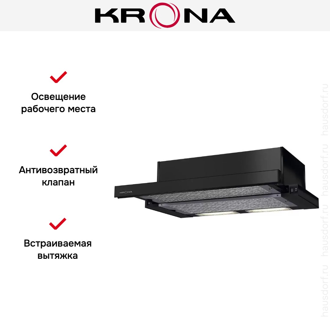 Встраиваемая вытяжка — выбор тех, кто хочет максимально задекорировать технику, или владельцев маленькой кухни. Обратите внимание на цветовые сочетания модели KRONA VENDY 600 BLACK (1 мотор), чтобы органично вписать ее в свою квартиру. Оттенок корпуса: черный. Благодаря лампочкам, которые расположены на нем, можно освещать плиту и столешницу рядом, чтобы готовить было еще проще и приятнее. Фишка этой техники — выдвижная панель.