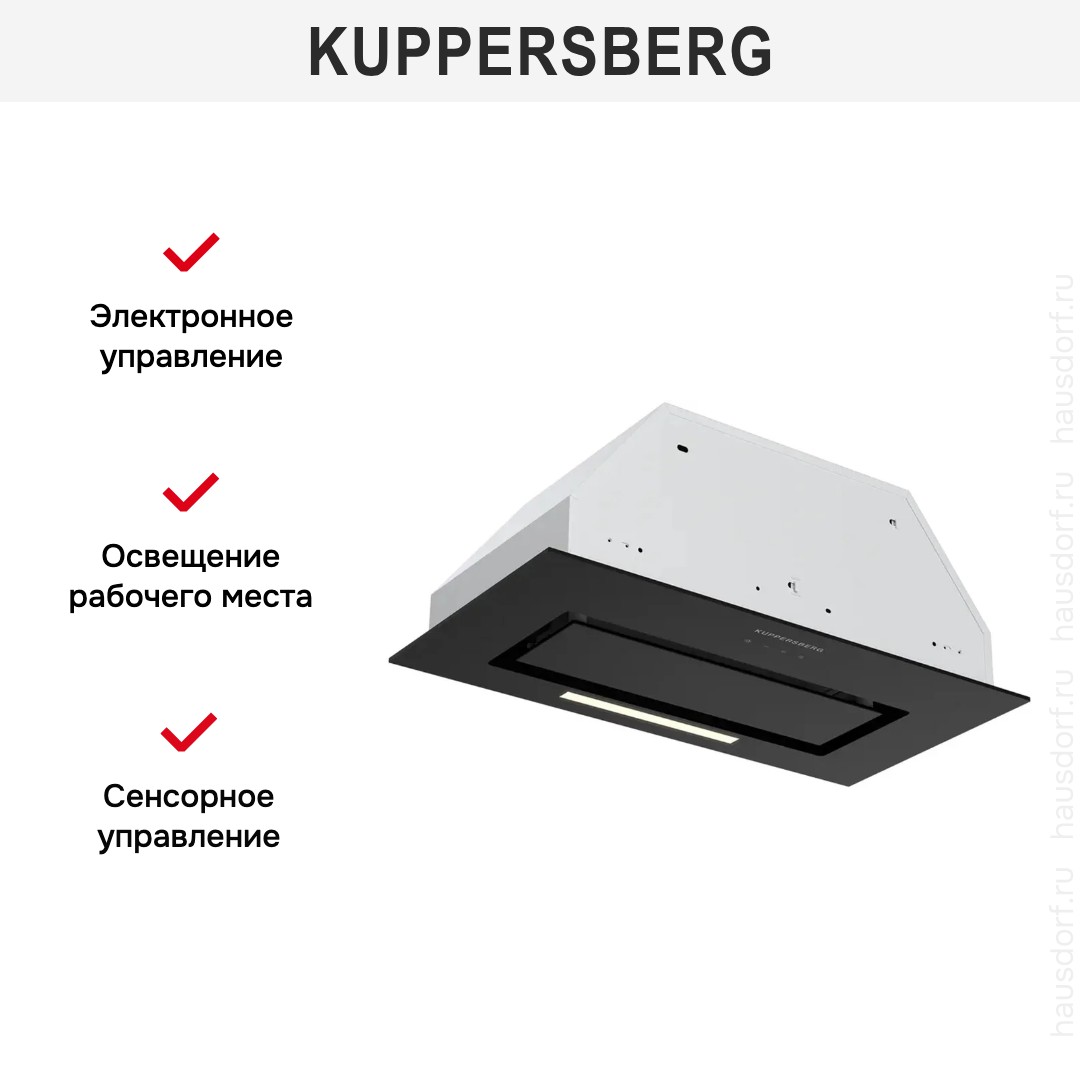 Встраиваемая вытяжка — выбор тех, кто хочет максимально задекорировать технику, или владельцев маленькой кухни. Тип встраивания: в шкаф. Обратите внимание на цветовые сочетания модели Kuppersberg INTOUCH-1 60 BG, чтобы органично вписать ее в свою квартиру. Оттенок корпуса: черный. Благодаря лампочкам, которые расположены на нем, можно освещать плиту и столешницу рядом, чтобы готовить было еще проще и приятнее.