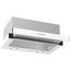 Можно выделить два основных вида вытяжек с выдвижной панелью. В вытяжках, встраиваемых в подвесной шкаф, выдвижная панель необходима, так как размеры таких устройств определяются размерами самого шкафа. В закрытом состоянии глубина вытяжки может быть меньше глубины варочной поверхности. Телескопическая выдвижная панель, которая устанавливается преимущественно в устройствах, работающих в режиме отвода, гарантирует полный захват воздуха, загрязненного каплями жира, частицами сажи, испарениями. Панель можно выдвинуть как нажатием на кнопку, так и потянув за ее переднюю часть. В некоторых моделях при подобном выдвижении одновременно включается подсветка. Когда же панель убрана, вытяжка становится практически незаметной — такой вариант лучше всего подходит для небольшой кухни.