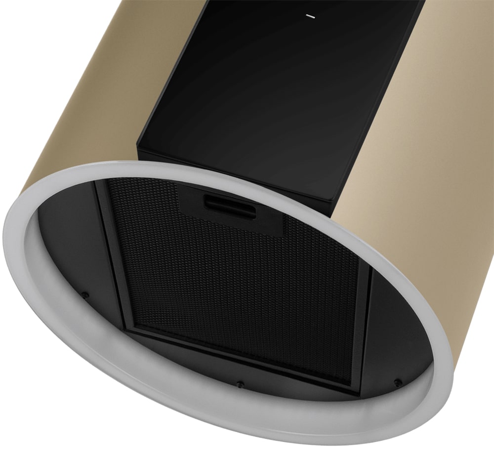 Данная вытяжка крепится к потолку — обычно над кухонным островом, где расположена рабочая зона. Обратите внимание на цветовые сочетания модели Maunfeld ALBA 39 Isla Gold, чтобы органично вписать ее в свою квартиру. Оттенок корпуса: золотой. Благодаря лампочкам, которые расположены на нем, можно освещать плиту и столешницу рядом, чтобы готовить было еще проще и приятнее.
