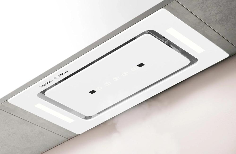 Вытяжка, встраиваемая в потолок, часто устанавливается над кухонным островом в просторной кухне и отличается достаточно высокой мощностью: она может работать как в режиме рециркуляции, так и в режиме отвода, так как воздуховод также скрыт в потолке. Вытяжки могут монтироваться в подвесной потолок либо устанавливаться в специальные многоярусные конструкции из гипсокартона непосредственно во время ремонта кухни. Для управления ими используется пульт ДУ.