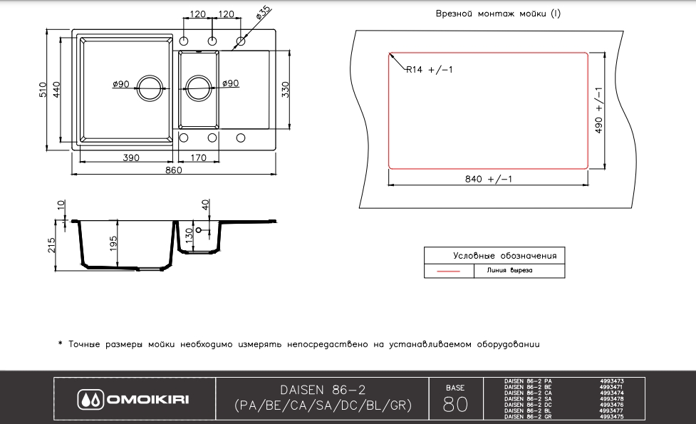 Omoikiri Daisen-86-2 BL - схема с размерами версия 2 к мойке на разных языках на Hausdorf