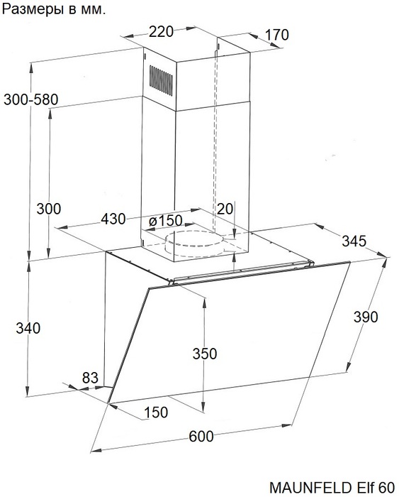 Maunfeld Elf 60 Glass White - схема с размерами к вытяжке на разных языках на Hausdorf